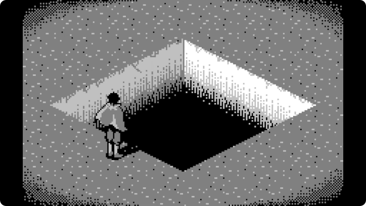 Void Stranger is a puzzle game. You control a character known as Grey. She appears to you primarily as a squished, low-detail Game Boy-style sprite, though she also is given a few wonderful pixel portraits. After a short, cryptic cutscene, you are dumped into a dungeon; when you go down the stairs and open a box, you receive a strange rod that allows you to lift and move floor tiles, one at a time. This is the main way you interact with the game: lift, move; lift, move.